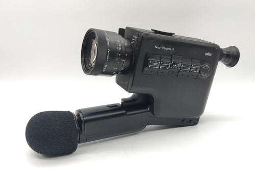 The Nizo Integral 5 is a very impressive looking camera, with a built-in folding shoulder rest and a zoom microphone that extends out to the front. The microphone can be removed (since sound film is no longer available), and the shoulder rest folds back neatly when not in use.