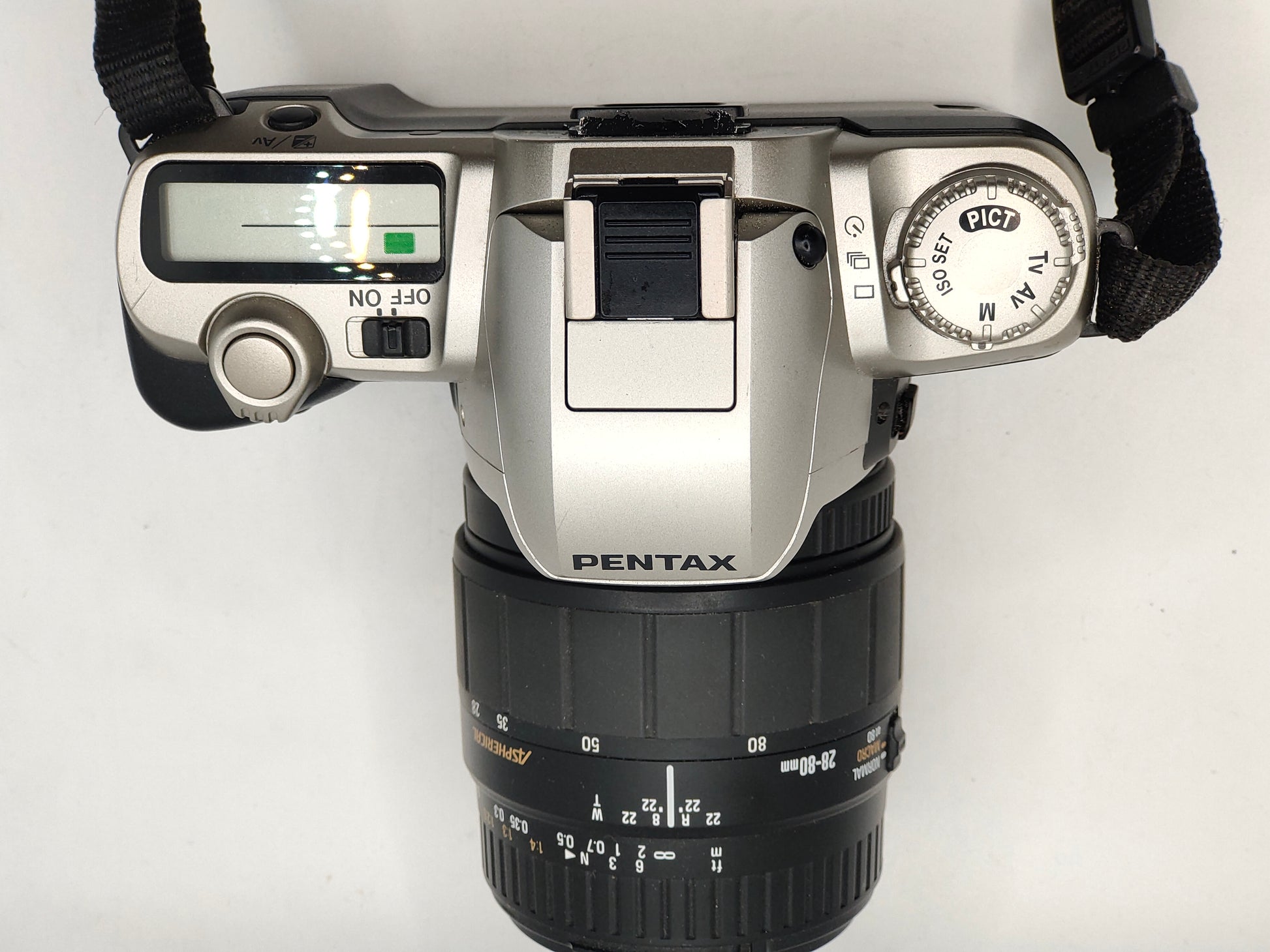 A nice easy to use point-and-shoot autofocus SLR from Pentax. With a handy 28-80mm (wide-angle > portrait lens). and pop-up flash. In full working order.