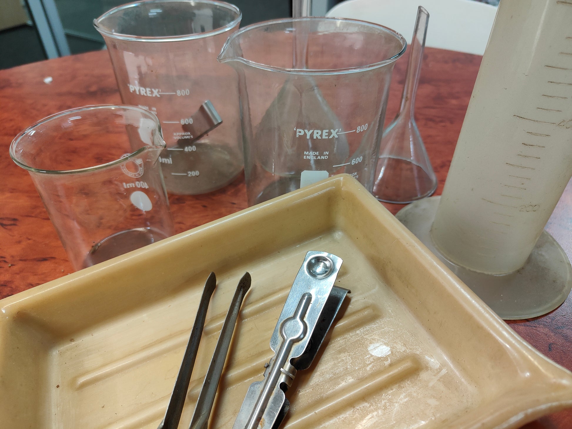 Set of measuring cups, funnels and trays for photo processing